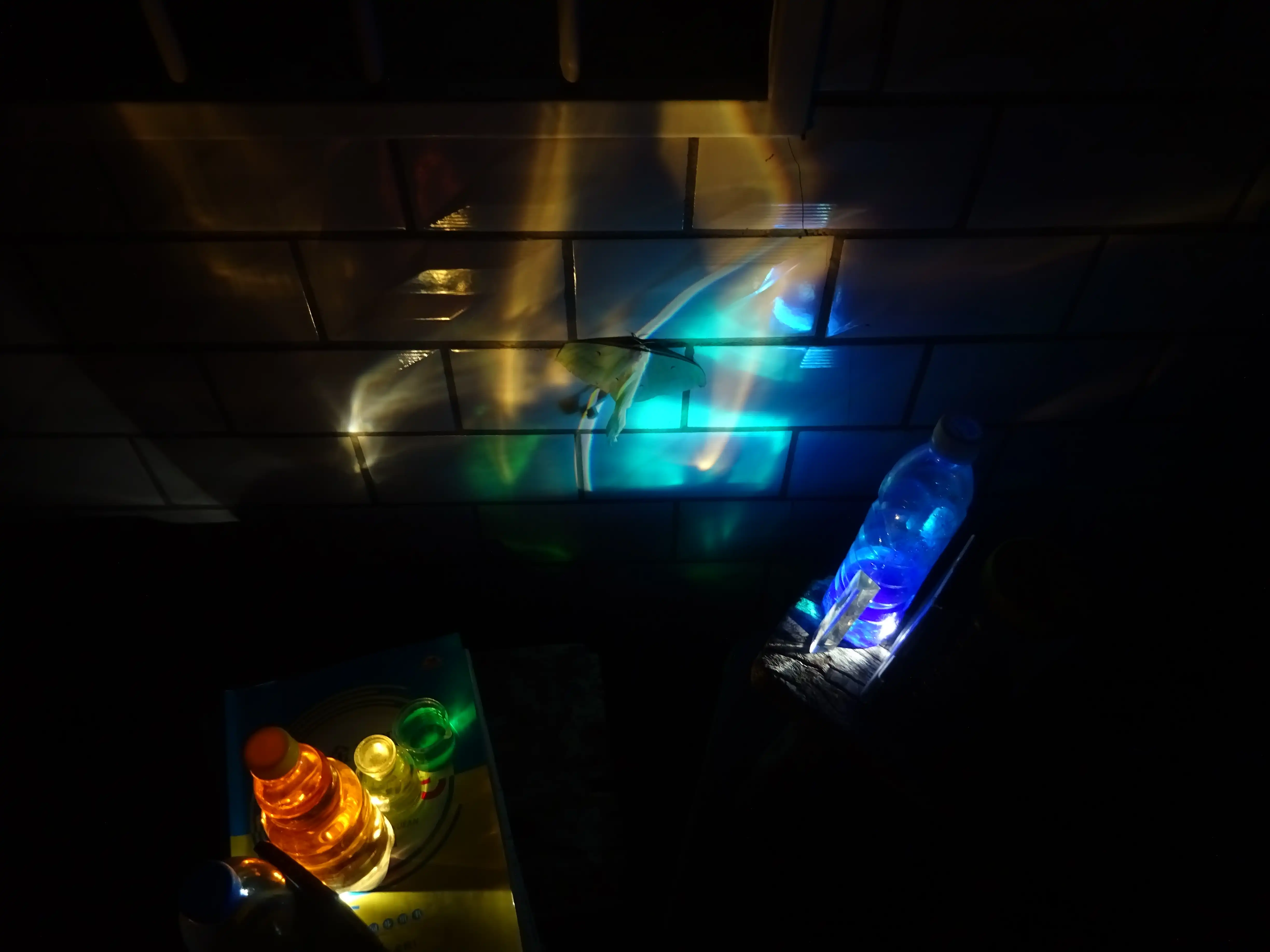 然后我就拿着手机的闪光灯照来照去,发现书架上放的溶液也可以透出更好看的色彩!顿时喜不自胜: