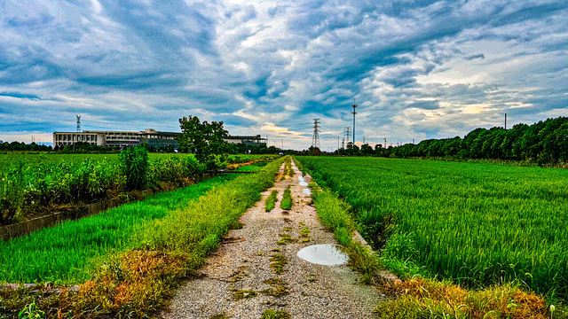 走到稻田中间,