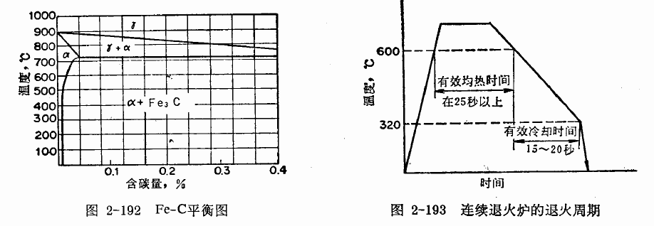 - 图2-192是铁碳平衡图的一部分,a-Fe中固溶的碳量随温度而异,320℃附近快速冷却固溶碳不能完全析出,而以固溶状态冷却下来。在冷却过程中如果不充分析出,以后过饱和的碳从固溶体中析出时产生时效硬化。因此在320℃附近必须缓慢冷却使a-Fe中固溶碳得到充分的析出。从600℃冷到320℃所需的时间称为“有效冷却时间”,有效冷却时间在15~20秒较好。320℃以下a-Fe中固溶的碳量不随温度改变,不妨快速冷却。退火周期的典型例子如图2-193所示。