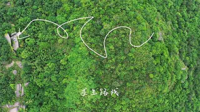 不过是我顶着被人们怀疑是头特立独行的野猪从树林里窜出来的勇气往前走罢了。最后从树林里找到被人踩出来的主干路结束求生,扔掉木棍开始往山顶进发。大概的路线如下:
