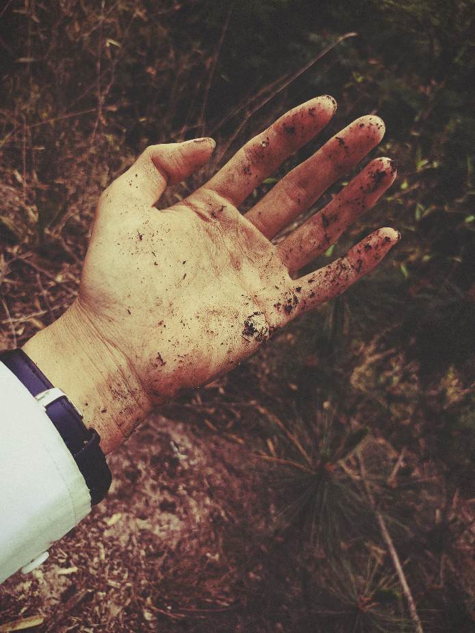 满手是泥,满裤子是泥,喷涌的汗水把眼镜弄花了。伸手摘掉眼镜,随手一放,眼镜又开始向岩石下滚去,还好我眼疾脚快,一脚踩住。