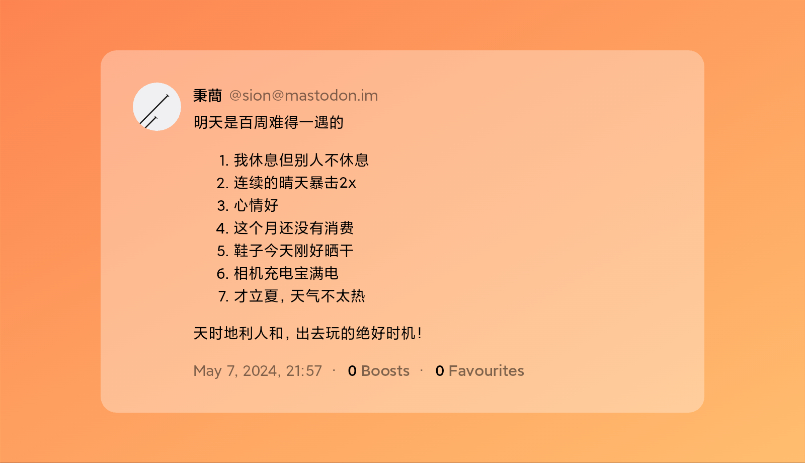 想不能再这么胡跑了,越紧张越容易出错。便定下神来,踩着眼镜歇了五六分钟,发了条嘟嘟。