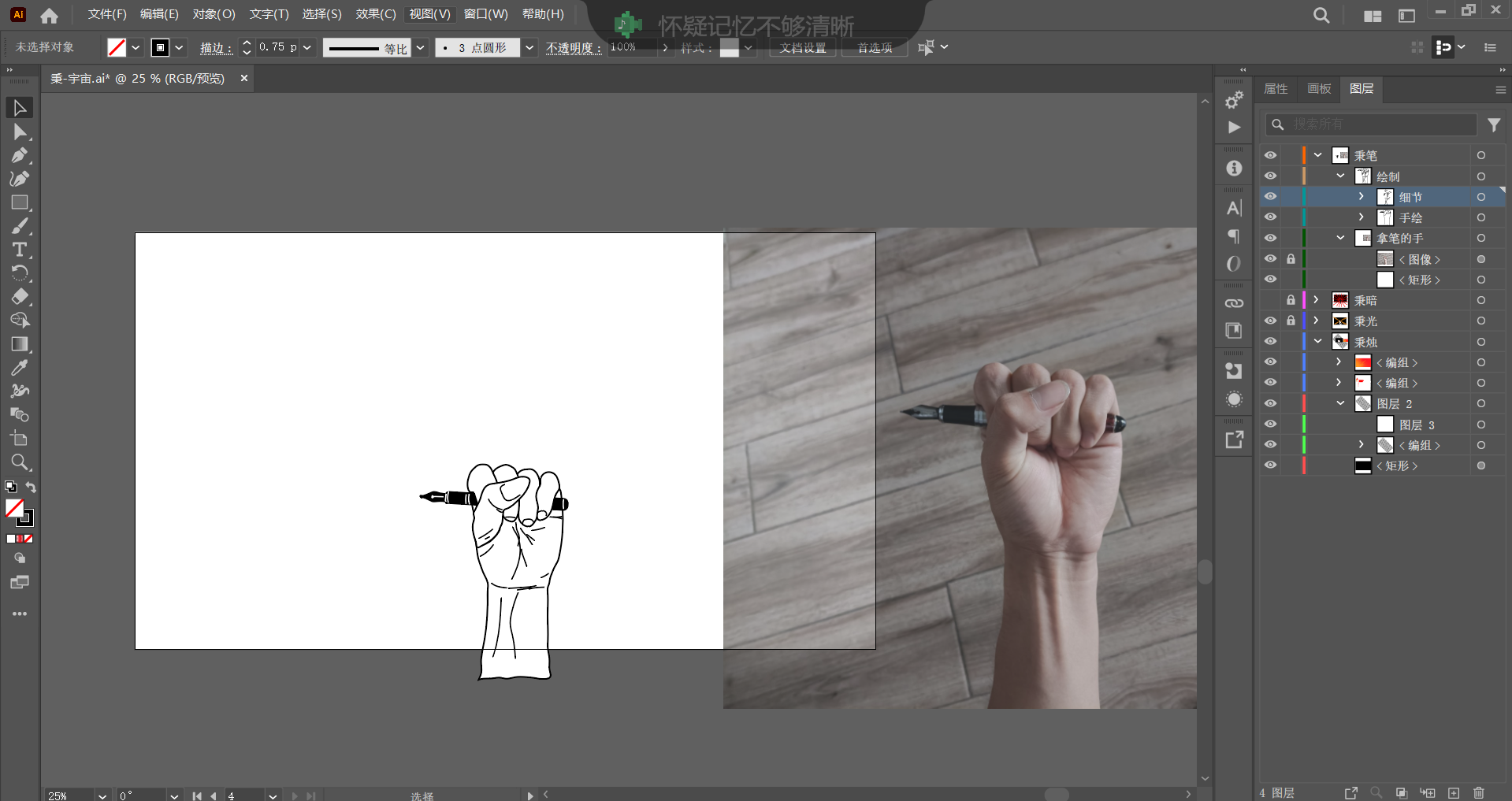 这张图,绘制过程中图层很麻烦。尤其是拇指,一边在相机之上,一边又在相机之下,上也不是,下也不是,最后用偷懒的二维画图法(把相机边缘描成拇指的轮廓,规避图层的冲突)解决。