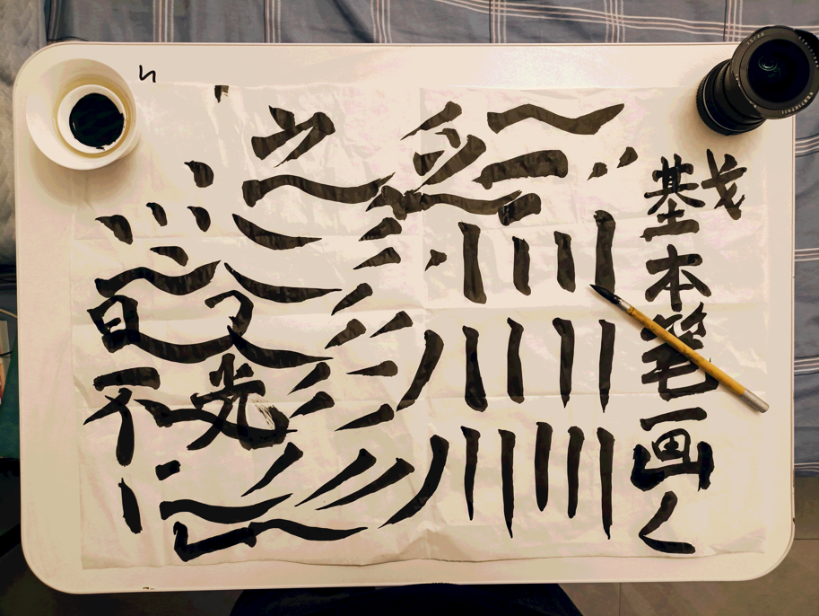 拿起纸笔,用小狼毫练习基本笔画。今天学的是欧阳询的欧体楷书,才写了一页,纸就用完了,甚至都没尝出味道来,也没什么大体会可以分享的,明天再去厂里废纸堆里寻些板正的纸来,好好写个几页。